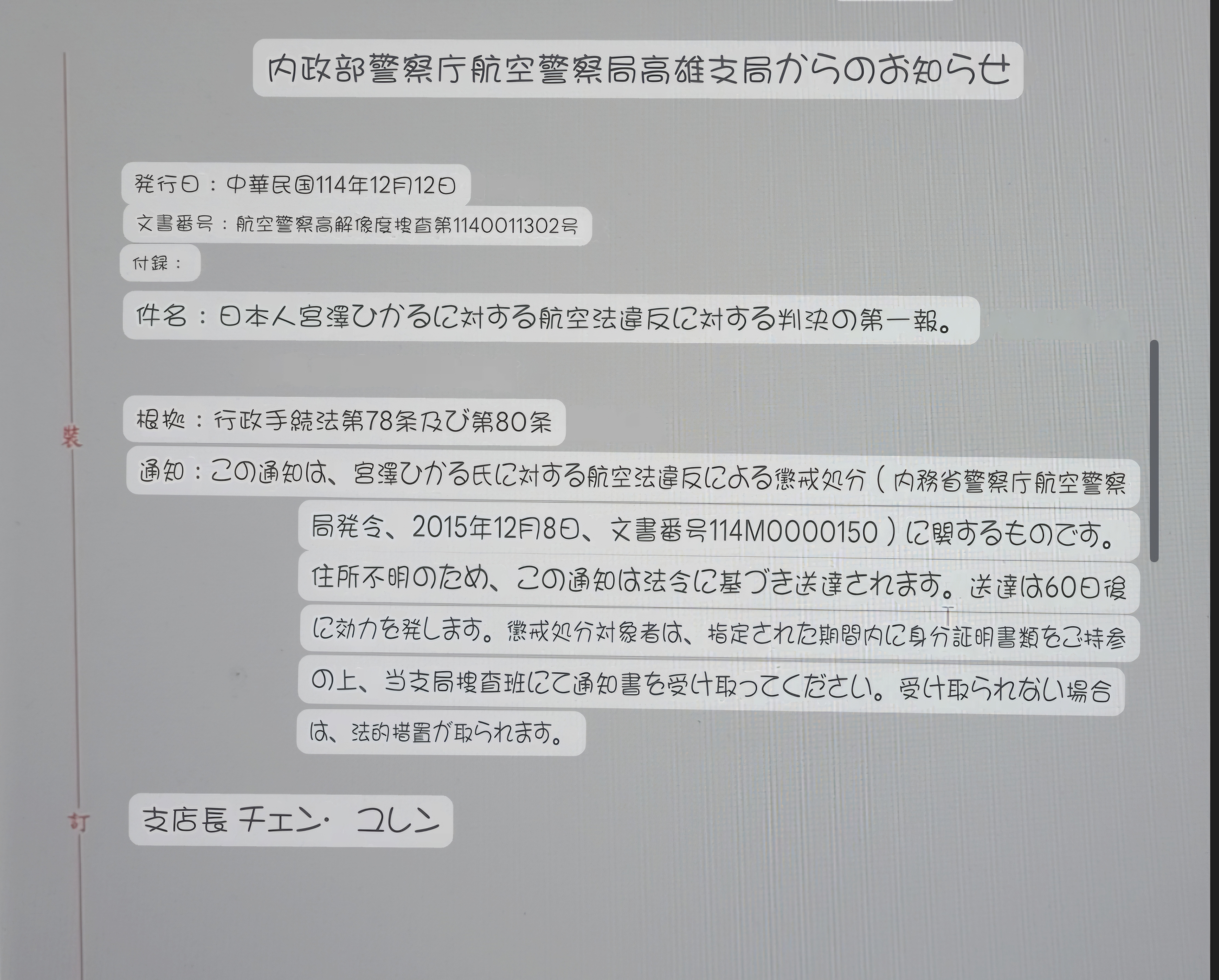 第1次公告領取日本籍受處分人MIYAZAWA HIKARU違反民用航空法裁處書